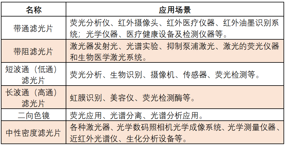 三、根据光谱特性,可分为中性密度滤光片、带通滤光片、带阻滤光片、短波通(低通)滤光片、长波通(高通)滤光片、二向色镜。