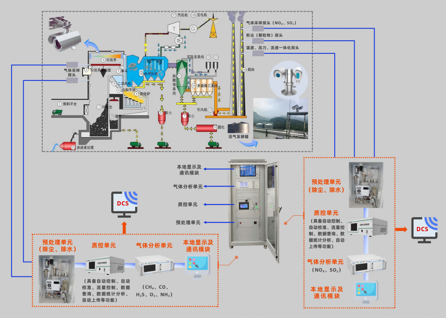 随着城市化进程加速,生活垃圾产生量激增,焚烧发电已成为主流处理方式。然而,垃圾堆放、焚烧和烟气排放过程都会产生各种有毒有害气体,对生态环境和人员安 全构成严重威胁。其中垃圾堆放储料坑和渗滤液处理设施中CH4、CO、H2S等可燃和有毒有害气体极易集聚;焚烧过程中焚烧炉出口烟气中O2(控制在6%~10%之间)、CO含量影响燃烧效率;烟气排放SO2、NOX和颗粒物等污染物造成显著环境危害;垃圾沼气发酵罐中沼气的泄漏给生产安 全带来巨大威胁。 随着环保超低排放和企业降本增效的要求,精准监测垃圾焚烧各环节的可燃、有毒有害气体和污染物已成刚性需求。建设一套精准、可靠的垃圾焚烧全场景气体在线监测系统,是保障生产安 全、履行环保责任的必然选择。