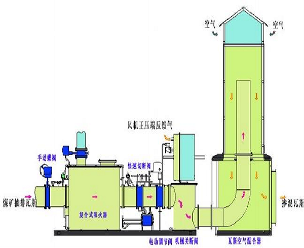 煤矿乏风及低浓度抽放瓦斯氧化技术的主要原理是蓄热式高温甲烷氧化,工艺方式是在不影响煤矿抽采系统的前提下,通过负压采集煤矿现有排空的20℃~30℃的乏风。抽放瓦斯通过正压输送进入乏风管道,经掺混装置将乏风与抽放瓦斯掺混至甲烷浓度1.2%后输送至蓄热式氧化装置。