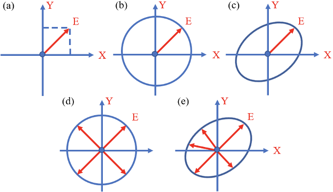 图2 不同偏振光平面示意图(所有光源皆沿着Z轴传播,E为电矢量):(a)线偏振光,(b)圆偏振光,(c)椭圆偏振光,(d)自然光,(e)部分偏振光